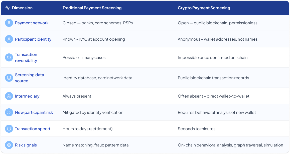 Traditional payment screening was built for closed networks — card schemes, correspondent banks, and regulated payment processors where every participant is identified and every transaction can be reversed. Blockchain payment screening operates in a fundamentally different environment.