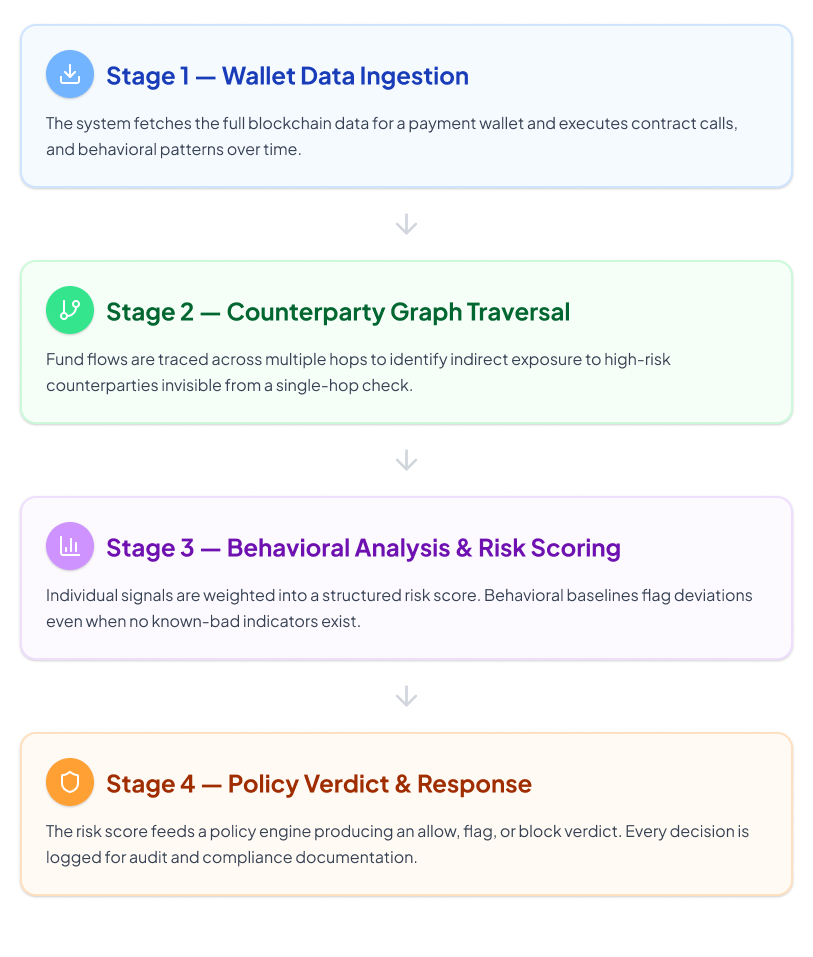 Static watchlists and known-bad address databases only identify wallets that have already been flagged. By the time a wallet appears on a watchlist, the activity that triggered the flag has already occurred — and a significant proportion of payment risk originates from wallets with no prior flags at all.