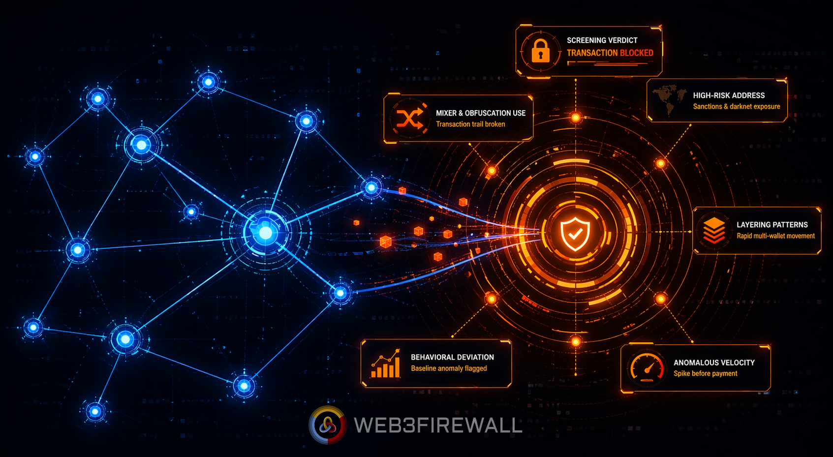 Interactions with cryptocurrency mixing services or privacy protocols designed to break the transaction trail. This is a high-weight signal in most crypto payment screening risk models.