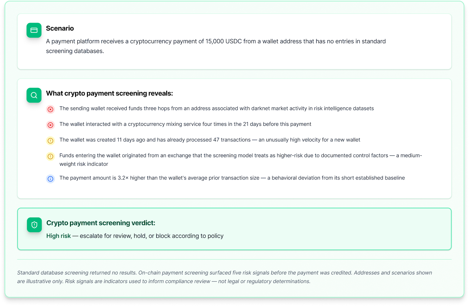 This example illustrates the core gap that crypto payment screening fills: a clean screening database result tells you a wallet hasn't been flagged before. On-chain behavioral screening tells you what the wallet has been doing. For payment platforms where a single high-risk payment can create regulatory exposure, both dimensions are necessary.