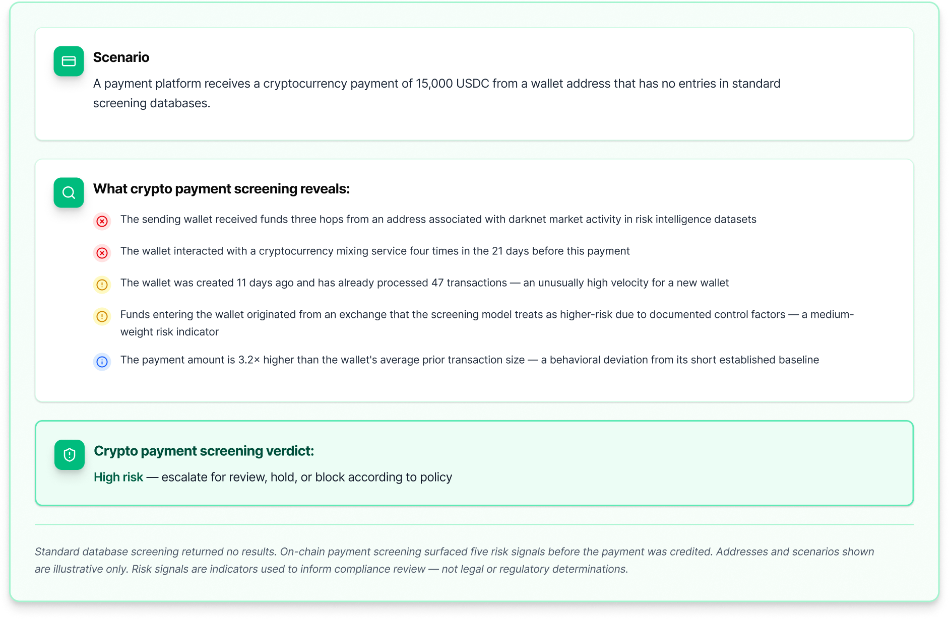 The core distinction:Traditional payment screening checks identity. Crypto payment screening checks on-chain behavior.
