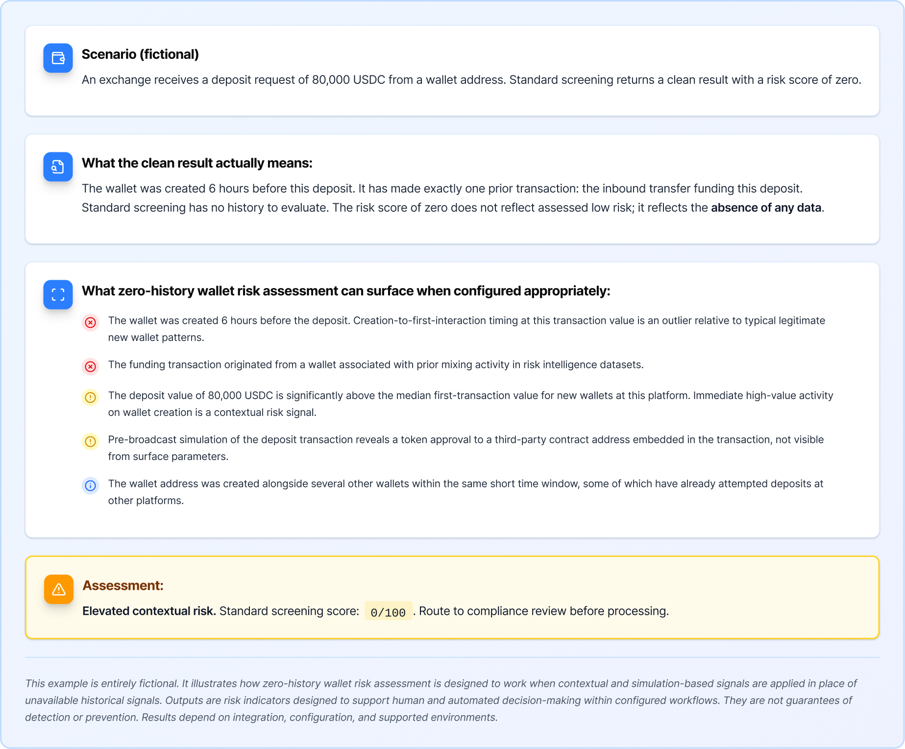 If a zero-history wallet has received an inbound funding transaction before the assessed transaction, the risk characteristics of that funding source can be incorporated into the assessment. A zero-history wallet funded by a high-risk address carries elevated contextual risk even without its own transaction history.